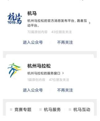 查了全部国内双金赛的公众号,只有杭州马拉松有两个,“杭马”和“杭州马拉松”。跟专业人士了解后才明白原来“杭州马拉松”是服务号,服务号每个月只能发4条消息,而“杭马”是订阅号,有关杭州马拉松的全部的消息都发在“杭马”,说白了,服务号不是用来服务的,请问那你为什么不关闭了呢?