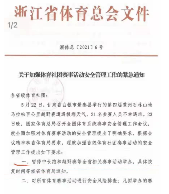 5月24日,浙江省体育总会紧急发布了《关于加强体育社团赛事活动安全管理工作的紧急通知》,宣布暂停中长跑和越野赛有关赛事活动举办,具体恢复时间等候省体育局通知。